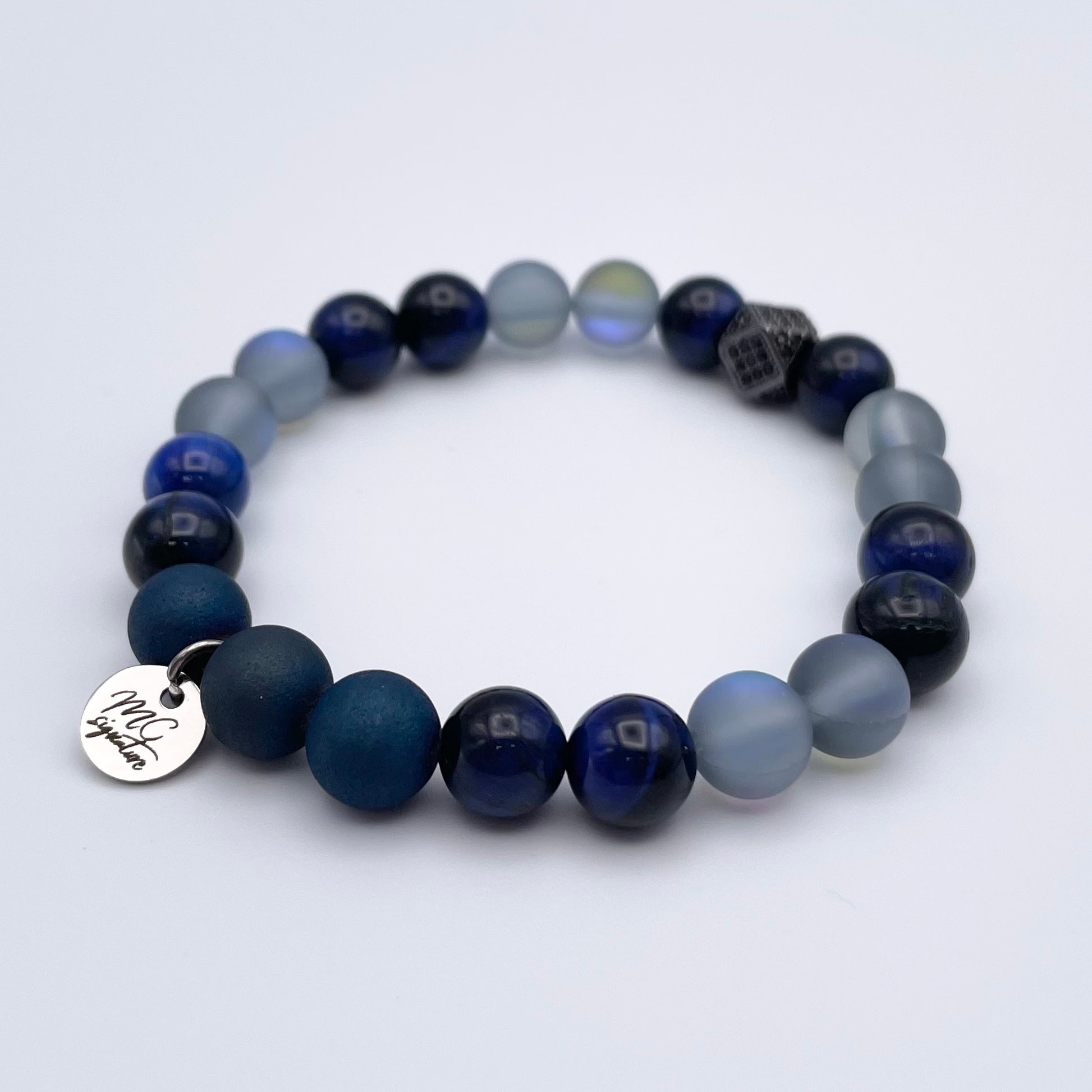Bracelet de pierres semi-précieuses composé d'oeil de tigre bleu, d'agate et de pierre de lune synthétique givrée.