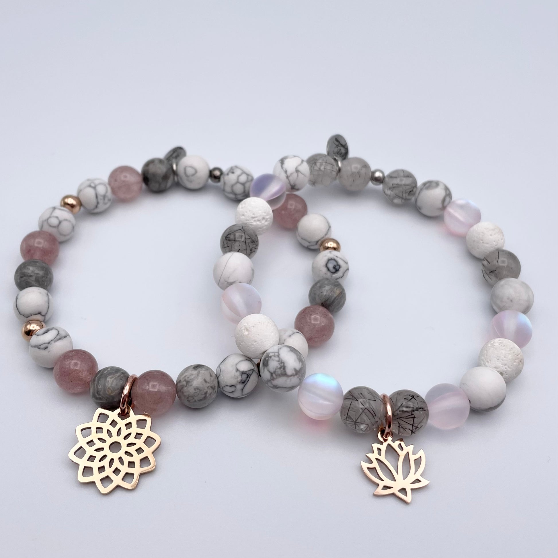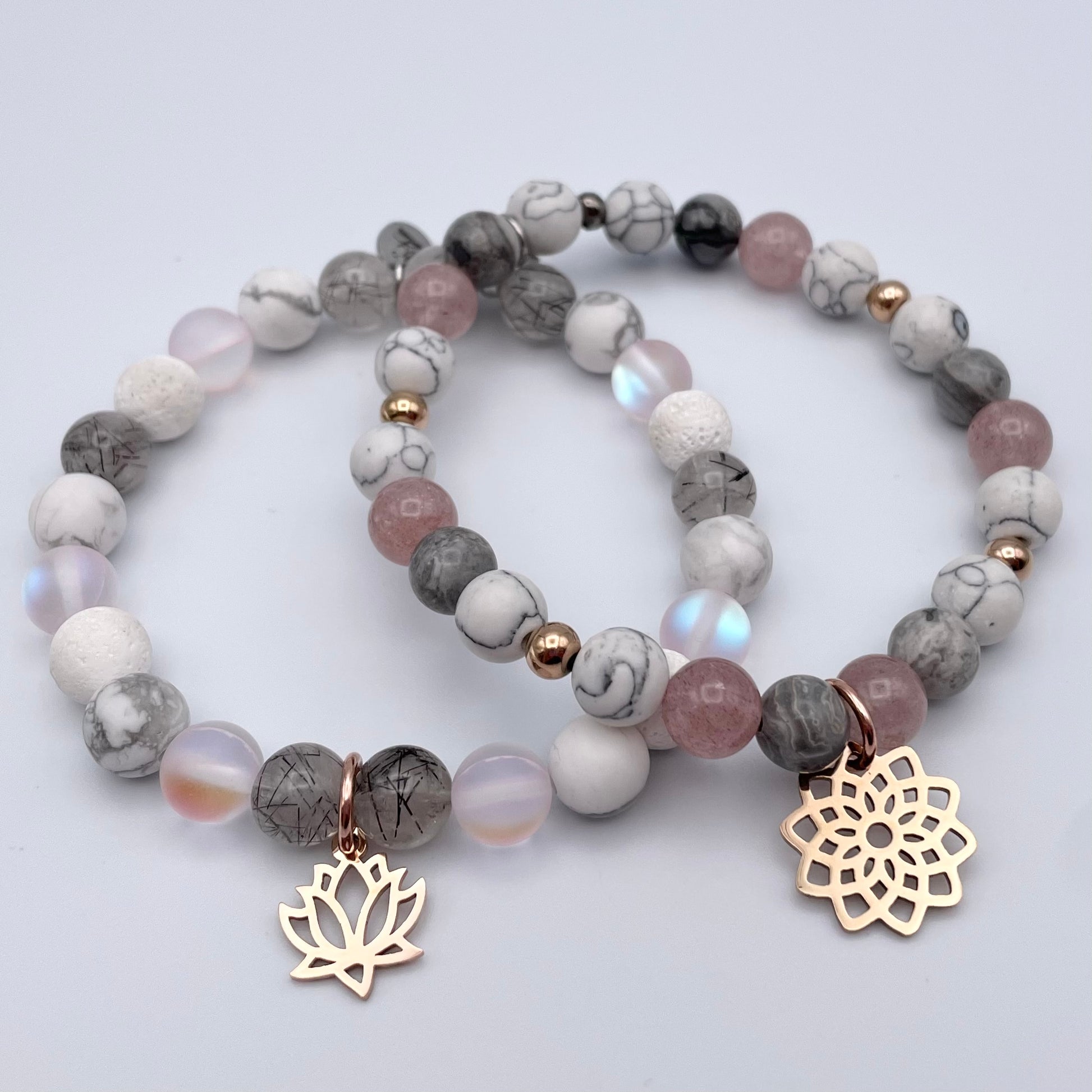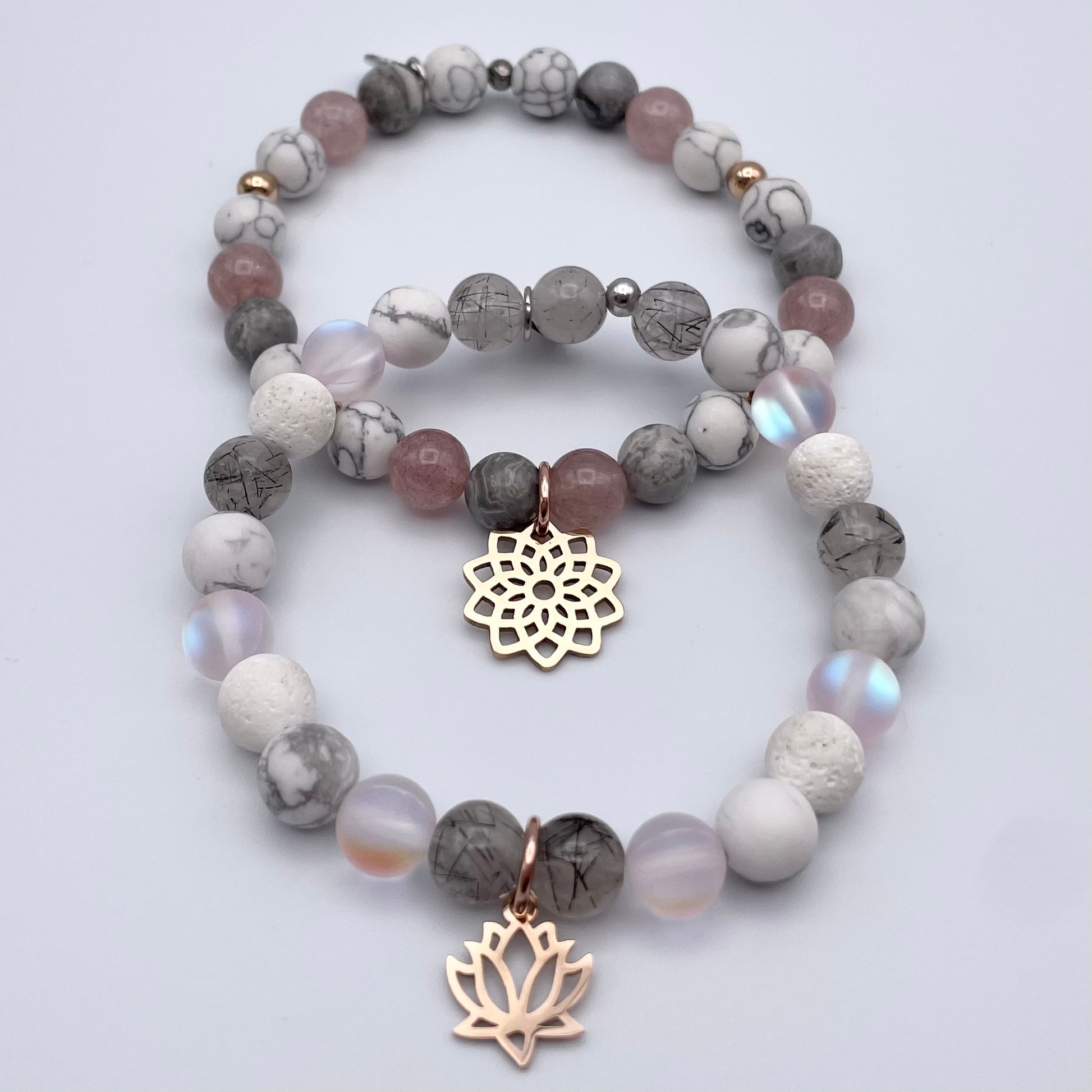 Bracelet de pierres semi-précieuses composé de quartz, de howlite, de jaspe, de pierres volcaniques et de pierres de lune synthétique.
