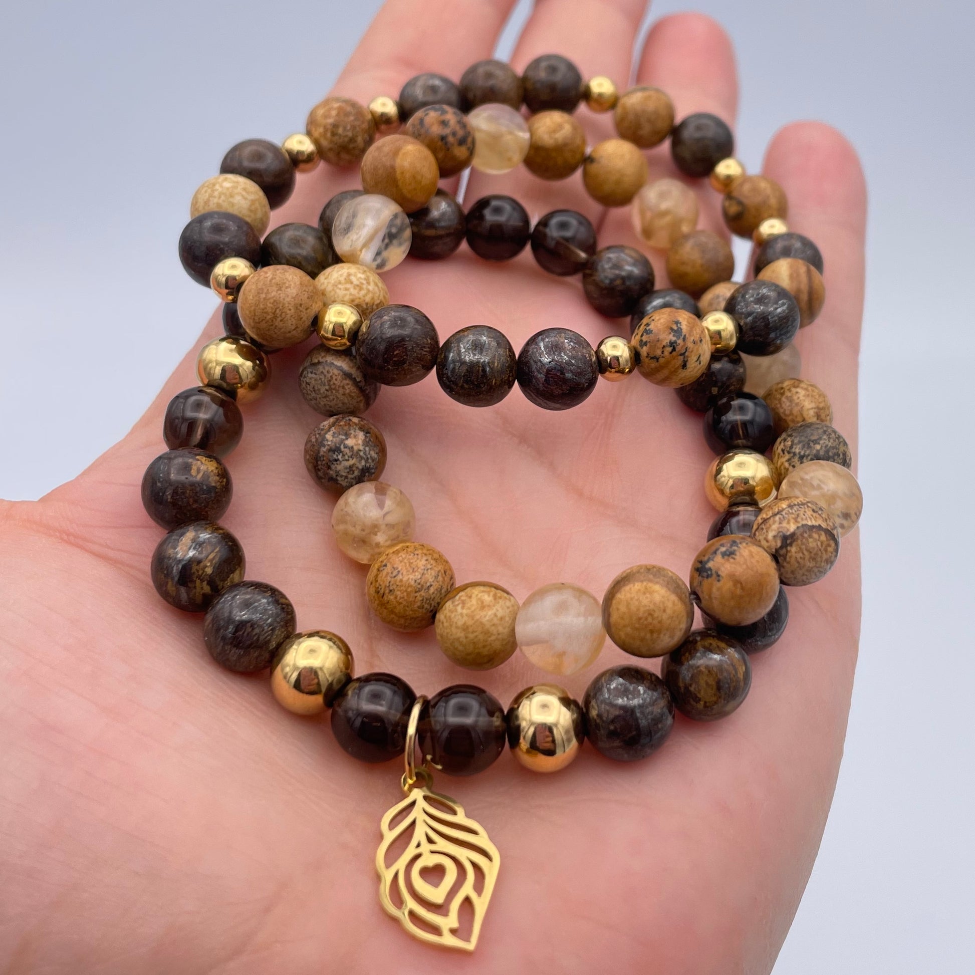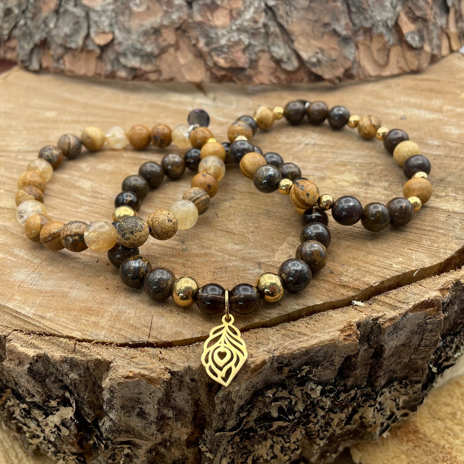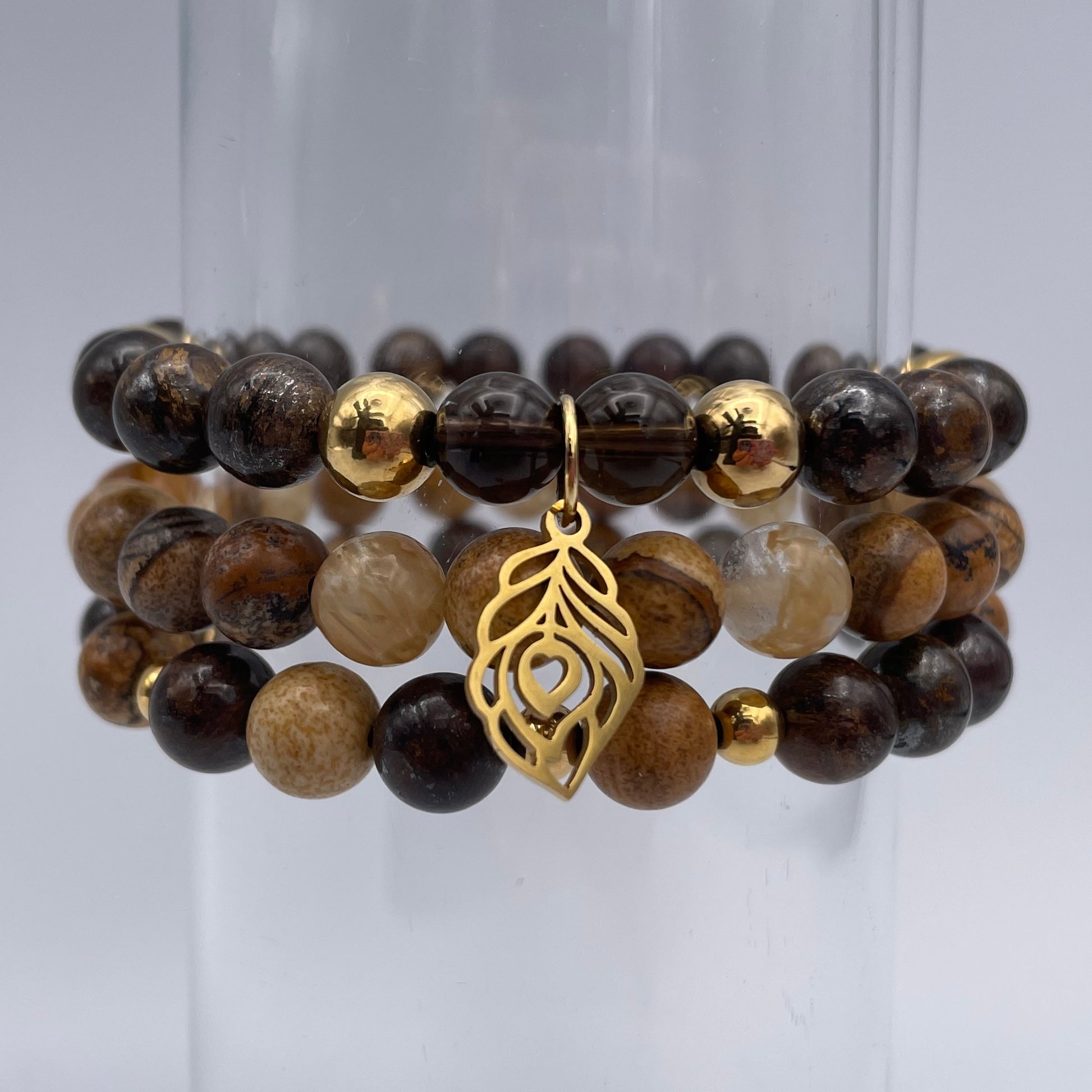 Bracelets de pierres semi-précieuses composés de quartz fumé, de bronzite, de quartz rutile et de jaspe naturel.